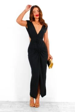 It Takes Time – Black Plunge Knot Detail Backless Midi Dress