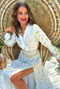 She Could Be The One – White Gold Feather Print Maxi Dress