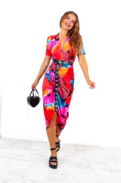 Simple And Elegant – Red Multi Print Short Sleeved Midi Dress