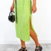 Slow down and enjoy the view… me! Send ’em into a spin in this green midi skirt. With has an elasticated waist and flattering high rise to offer the perfect fit. Complete with a mesh overlay, and a side split to to show off those pins. Slip on with a graphic tee and chunky block heels for day drinks with the Dolls. You’ll be turning heads for all the right reasons!Â