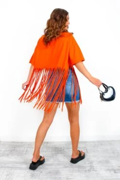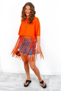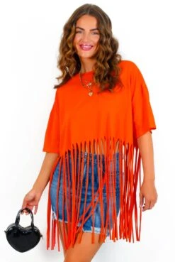Forget beach bods, this summer we’re getting totally shredded!Ā Take your sunny seasonĀ wardrobeĀ to the cutting edge with this striking orangeĀ tassel t-shirt.Ā A festival-ready flip on the classic slouchy tee, this zesty orsnge t-shirt with tassels shows off a trending oversized fit, dropped shoulders and aĀ statementĀ half-way tassel hem for all the chic and edgy drama. Whether it’s stagefront or seafront, tear down the style competition in distressed denim shorts and chunky sandals.