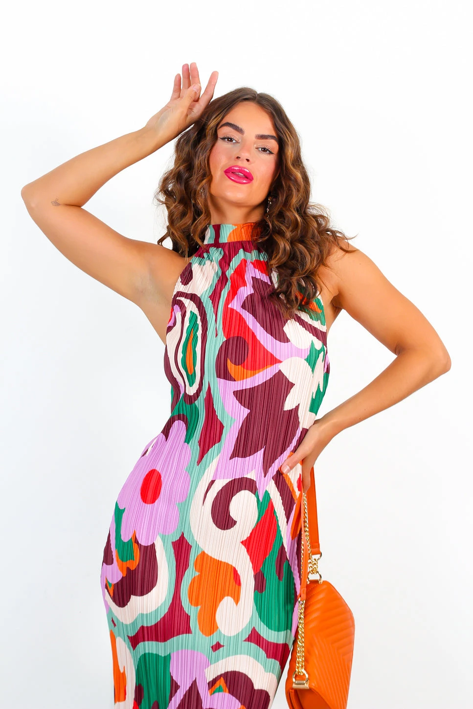 You look incredible, Doll, that’s all that matters. Stun in our All That Matters maxi dress! With its fitted plisse material and abstract floral print, it has a super comfortable stretch fit all while showing off your glowing skin in a daring halter neck design. Dress it down for festival vibes with chunky boots and a fedora. Let your ‘fit do the talking and get ready to slay all day!Â