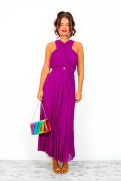 It’s time to release your inner goddess. This divine maxi dress features a magenta plisse top that flows into a drapey pleated skirt, cross-over bust, and a matching tie belt to shape the waist. Pair with strappy heels, your favourite bag and a fierce attitude for an instant win at any special occasion.