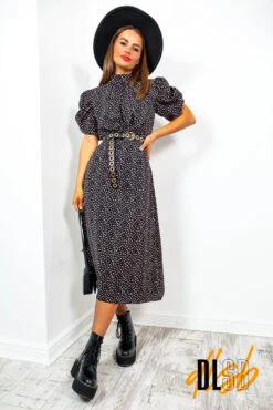 It’s a crime to hate polka dots you know, pass it on. This black and blush printed midi dress features a high neck, short puff sleeves, and a cinched waist to shape. Style with tights and chunky boots, no accessories need in this number!Â