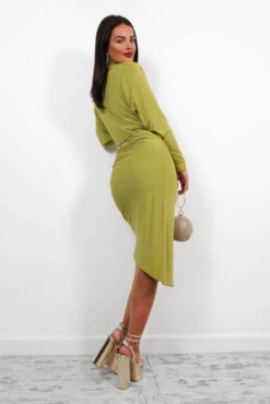 Always impeccably dressed. Featuring a wrap style v-neckline, long batwing sleeves, a ruched bottom leading into a saucy side split, and with slinky flattering material, this dress is the ultimate mix of sophisticated and sexy. The more gold the better for accessories, and you’re ready with main character energy for that birthday night out.Â