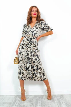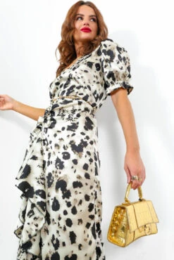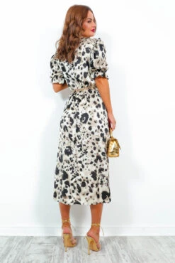 Make ’em speechless in this stunning leopard print midi dress. This number comes in a black and champagne leopard print satin feel fabric, short elasticated sleeves, V-neckline, a ruched middle leading into a frilled hemline, ugh obsessed! Wear it to dinner in classic green mules and gold jewellery.Â