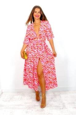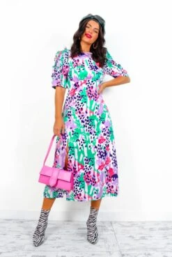 Make ’em speechless in this stunning leopard print midi dress. This number comes in a black and champagne leopard print satin feel fabric, short elasticated sleeves, V-neckline, a ruched middle leading into a frilled hemline, ugh obsessed! Wear it to dinner in classic green mules and gold jewellery.Â