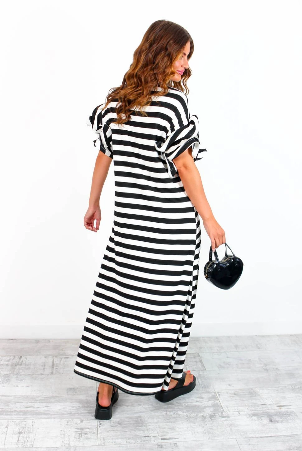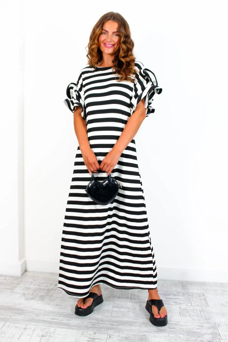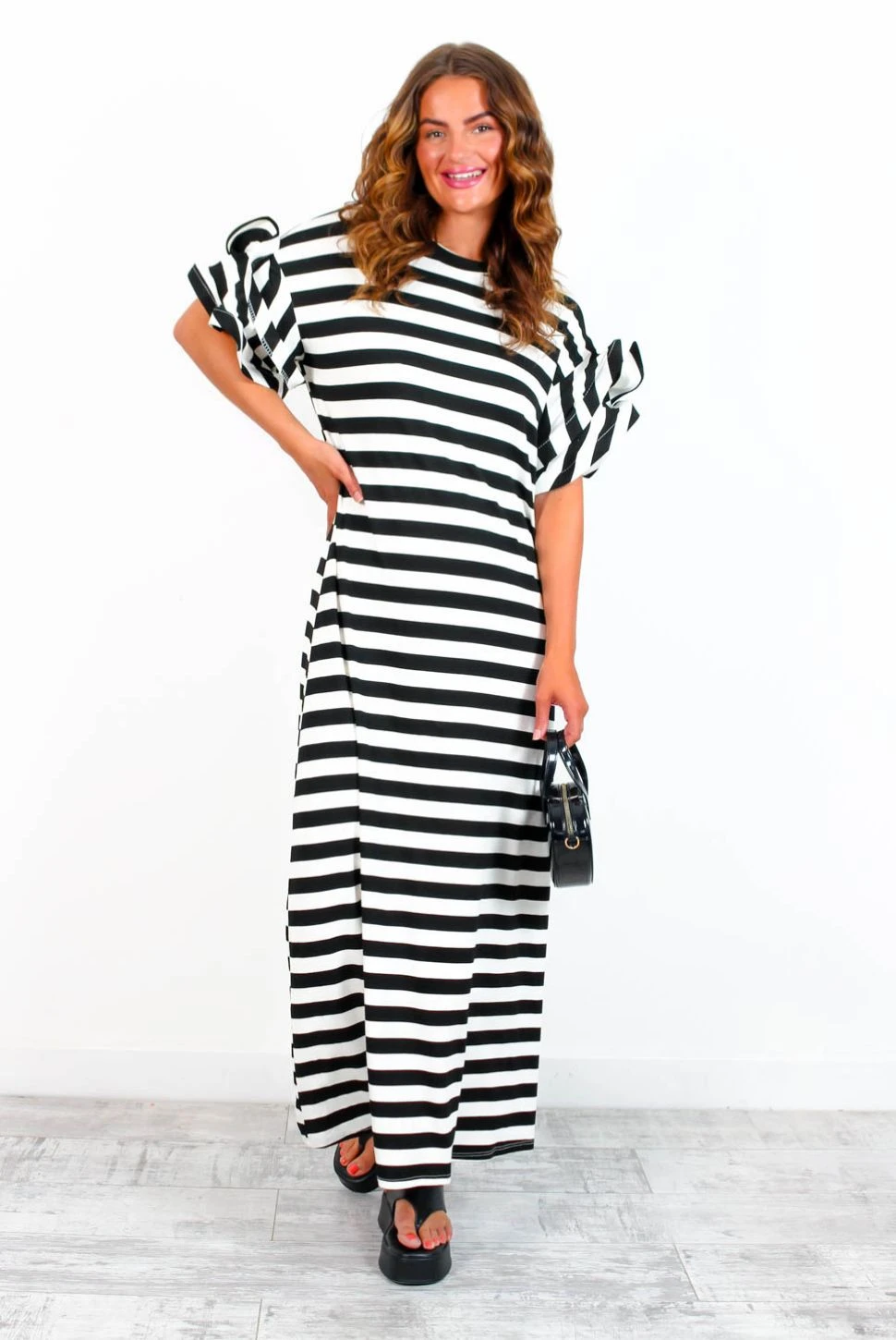 Feelin’ fine! Take off-duty to the next level in this monochrome maxi dress. With a comfortable stretch material, boasting flouncy ruffled sleeves and a sleek black and white stripe pattern, this day dress is sure to make a statement! Slip on with chunky boots and a bold lip for an effortless but utterly fabulous day-to-day look. Casual never looked so good, Doll.Â