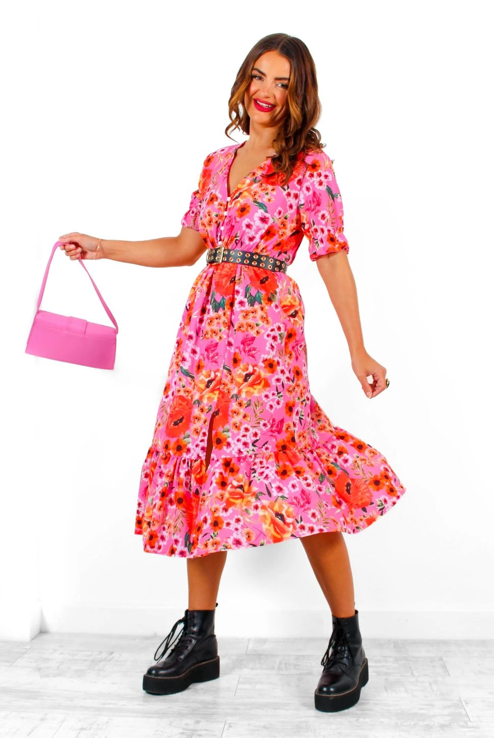 Get ready to bloom! Live that flower girl fantasy in this flirty and fabulous floral print midi dress! This super cute flowery number features a forever-flattering midi silhouette, bold pink and red floral print, button down front, and short puff sleeves. Whether it’s mates dates at the beer garden, or strolling the sun-drenched Spanish streets, let the good times blossom with matching pink accessories.