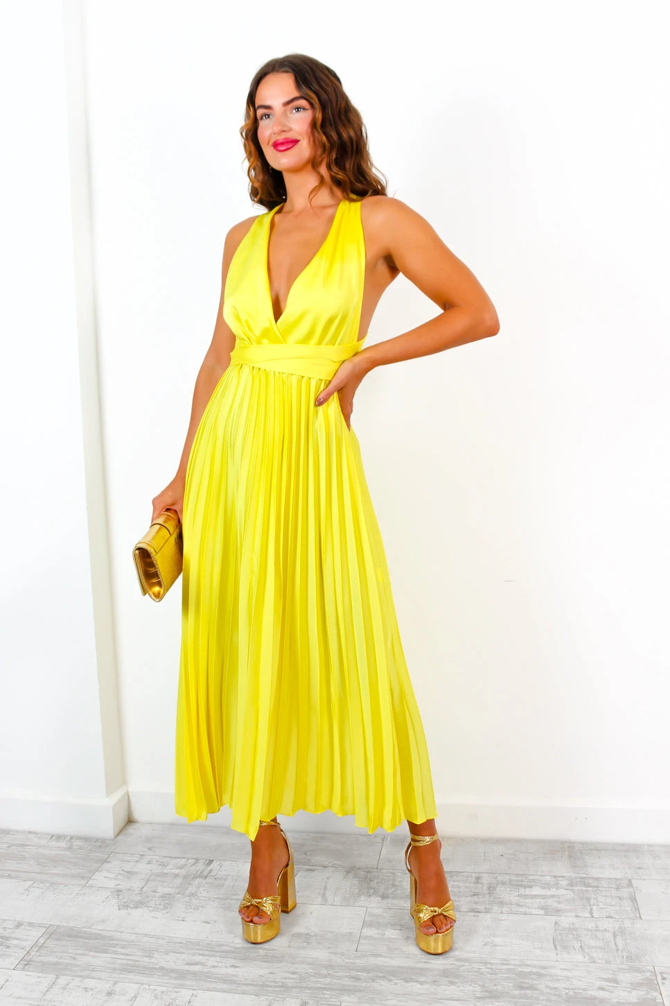Unleash your inner goddess in this timeless yellow pleated midi dress. In a zesty yellow colourway and featuring a halter neck plunging neckline that can be tied multiple ways, this silky yellow dress is pleated throughout with a satin finish that gives it a stunning glow – mesmerizing! Captivate the room and radiate that goddess energy in all golden accessories.