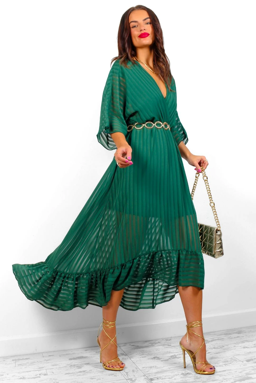 Get a taste of the sweet life in this simply stunning forest green midi dress. Featuring floaty mid length sleeves, a high-low frilled hem that’s perfect for swishing around the dancefloor and a plunged cross over neckline. An absolute essential for your occasion wear wardrobe! Team with glam gold heels and a statement belt for an elegant evening look.