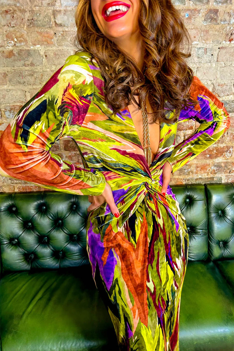 Don’t wait for the perfect moment, take the moment and make it perfect! With modest long sleeves, a daring plunged neckline complete with twist knot detail and a subtle front split, any moment is perfect in this head turner of a midi dress. Stay tonal with golden accessories or go for purples to make the abstract prints in the dress pop!Â