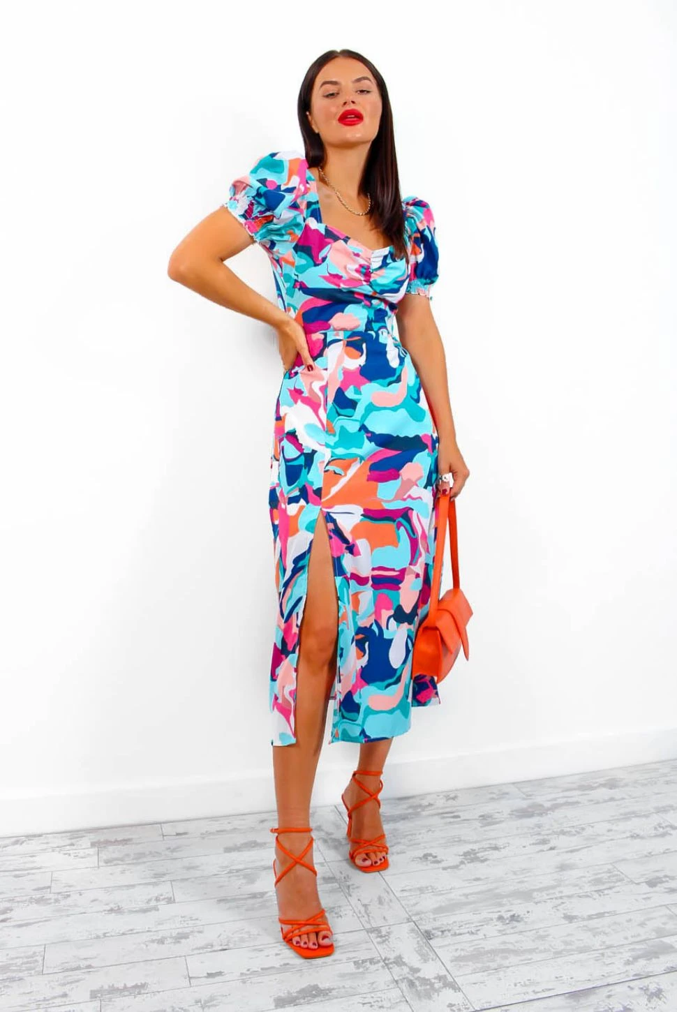 Introducing your new fave midi dress. With its on trend short puffed sleeves, romantic sweetheart style neckline and that peek-a-boo thigh split to give it a little sass – it’s no wonder it’s got us in a total frenzy! We love a matching accessory, so a blue mini bag and matching blue mules will finish your ‘fit perfectly and have those compliments rushing in.