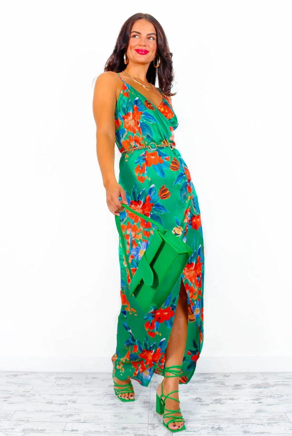 Let the good times bloom! This midi dress has Summer shenanigans written all over it, with its strappy design and wrap style front creating a sassy thigh split. Blooming in green florals and a silky satin finish, grab a bottle of bubbly and you’ll be ready to shimmy in the sun! A slick of red lipstick and lashings of gold jewellery finishes this look perfectly for that garden party you’ve been invited to this weekend.Â