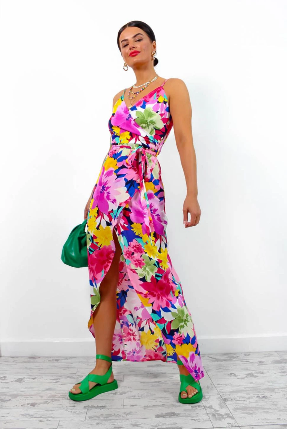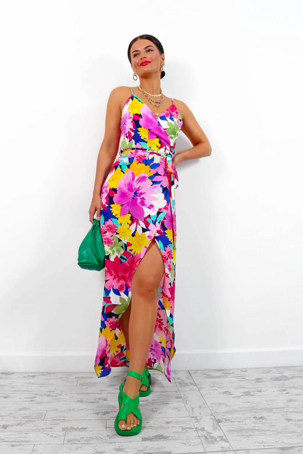 Its’s officially beer garden weather! Featuring a black base with multi-coloured floral design, this midi sports spaghetti straps, a wrap-style design, crossover neckline, rear-zip fastening, and a leg split to just above the knee. Style with chunky black sandals and a cute headband for a day drinking look perfect for your social media feeds!Â