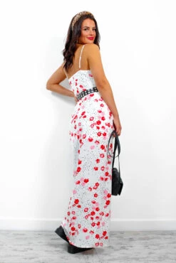 We’re always up for a party!Ā This white cami dress trails to the floor in a maxi length, blooming in red and pink florals with peppered black dots throughout. It screams Springtime garden parties with it’s adjustableĀ spaghetti straps andĀ wrap-style silhouette that creates a sassy split. Cinch the waist with a faux leather grungy belt and chunky platform sandals for a go-to day drinks in the sun ‘fit. Pass us a drink!Ā