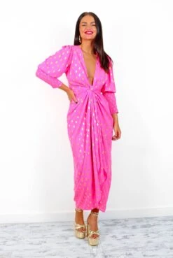 When I’m wearing pink and gold, I just can’t be told! This dazzling midi dress features a bright pink colour with gold foil spot print throughout, 3/4 shirred sleeves, and a wrap-style front which can be worn V neck or plunged. Coordinate with a metallic gold bag and heel combo for a glam-tastic finish to the perfect going-out-outfit.