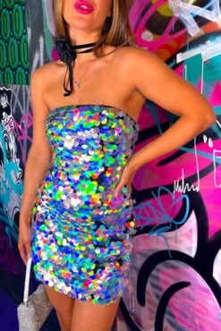 The parties over here, Doll! Made for those who love the thrill of a party, this sequin mini dress is a shimmering statement! With its silver hue and shimmering sequin embellishment all over, it’s perfect for setting the night ablaze in the club. Slip on with a pair of stilettos to take your party ensemble to a whole new level of fierce for nights out with the Dolls or take it to festivals in chunky boots.Â