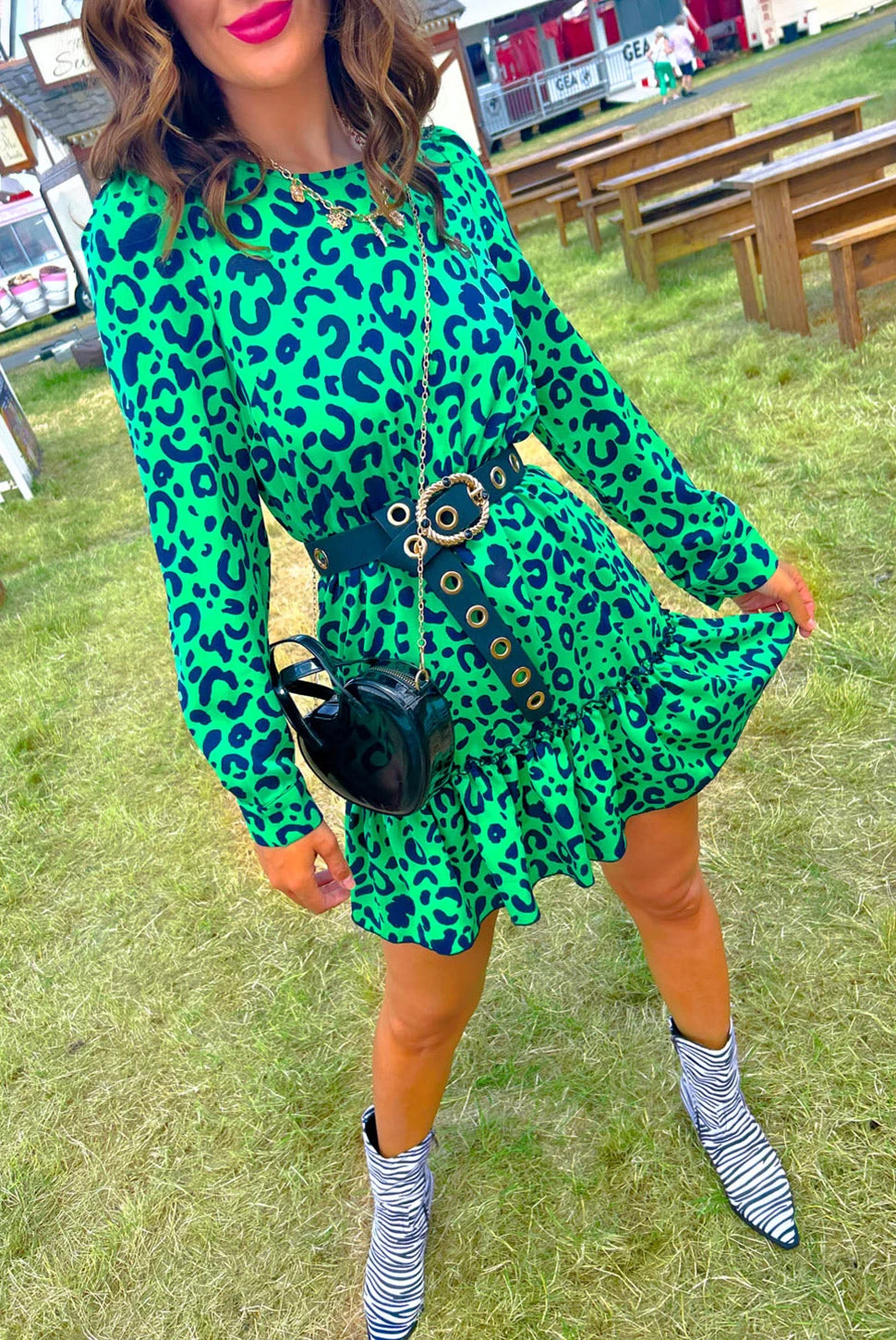 Bad vibes don’t go with my outfit! A little on the wild side and in an all over green leopard print, this flirty mini is a fierce addition to any Doll’s wardrobe! Complete with a tiered hemline and long cuffed sleeves, it’s sure to get heads turning. Boozy brunch plans with the girls? Add a slick of red lipstick and strappy heels for a glam vibe that’ll take you from day to night. Pass us a prosecco!Â