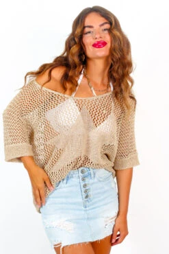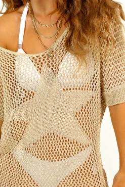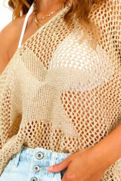 Gotta crush on your ‘fit! Send ’em starry eyed in this glimmering gold crochet top. Perfect as a beach coverup, it’s metallic threads shimmer in the sun light – or the spotlight if you’re taking this to the club! In a relaxed stretch fit and complete with star detail, slip this on over your swimwear with denim shorts for those beach bar drinks to cool down in the sizzling sun.Â