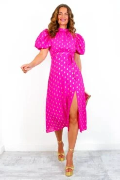 Don’t just be seen, Doll, be spotted! ForĀ those times you wanna make an entrance,Ā it’s gotta beĀ our iconic ‘Got The Flower’ high neck midi dress. Complete with short puff sleeves and a side leg split, we’re bringing the bold brights this sunny season with this hot pink hue and luxe gold foil spot print. Add extra oomph to your special occasion style and pair with bold fuchsia accessories. Those complements will pour in like prosecco!