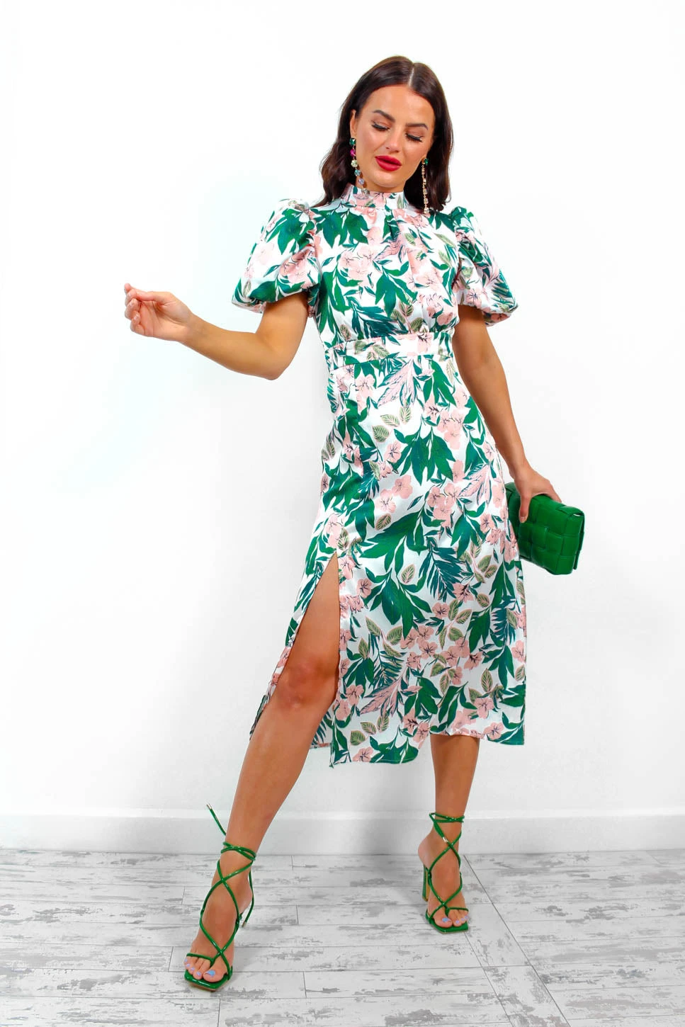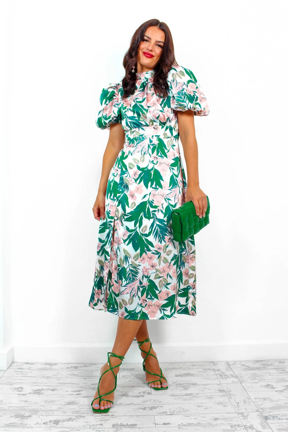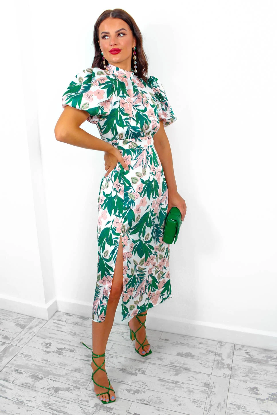 We’ve got all the feels for this dress. This elegant number features a soft tropical print throughout, short puffed sleeves, a high neck, and a split leg. The perfect dress for welcoming in those summer events, style with light pink accessories for a beautiful wedding guest outfit.Â