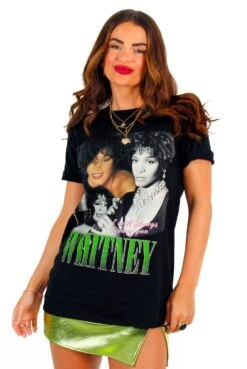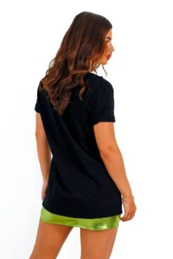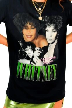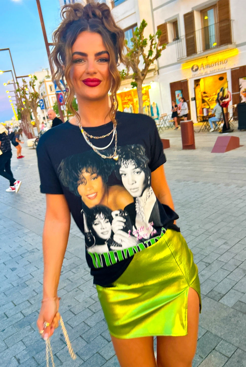 And IIIIIIIIII will always love… this tee! Featuring a classic crew neck tee fit in black with a Whitney “I Will Always Love You” print – it’s our greatest love of all for sure! Wanna dance with somebody? Style oversized with a green metallic mini and your highest heels for day drinks and a boogie with the girls!
