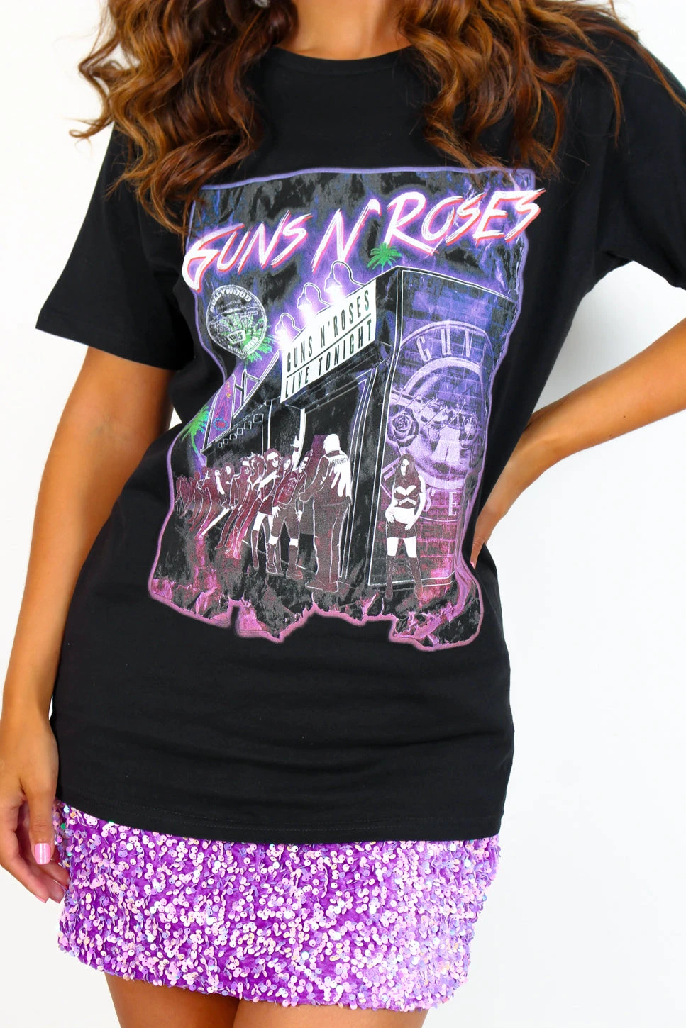 Welcome to the jungle, Doll! Serve thoseĀ not-so-sweet child o’ mine vibes in this amped up Guns N RosesĀ graphic band tee. FeaturingĀ a classic crew neck t-shirt fit in a black with a grungy deep purple Guns N Roses graphic print. Take it on tourĀ tucked into a purple metallic mini skirt with killer heels for a night on the with the girls or chunky boots for head turning festival vibes.Ā
