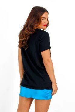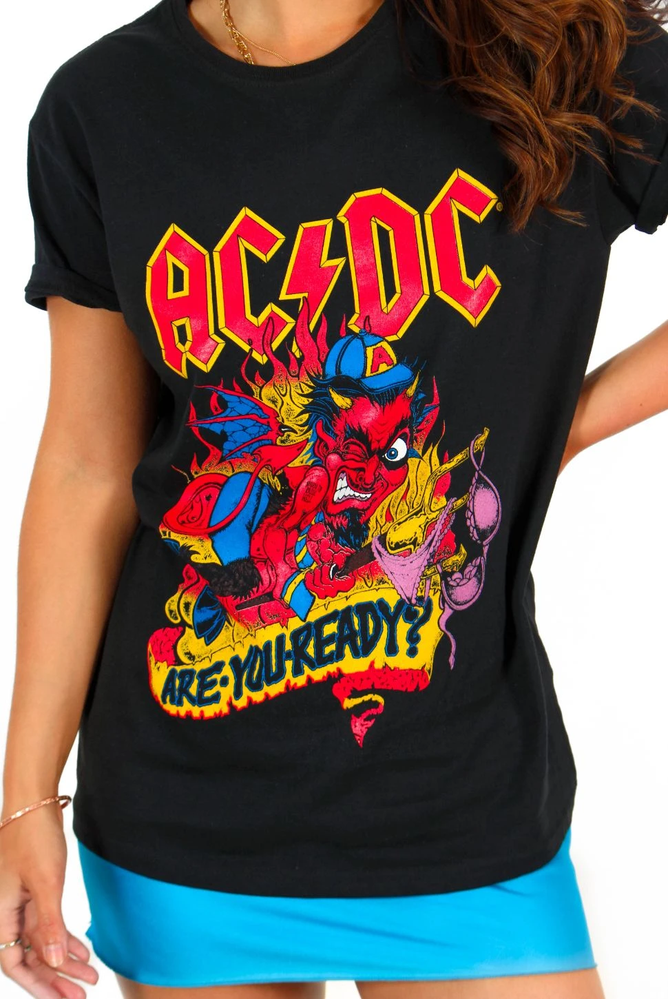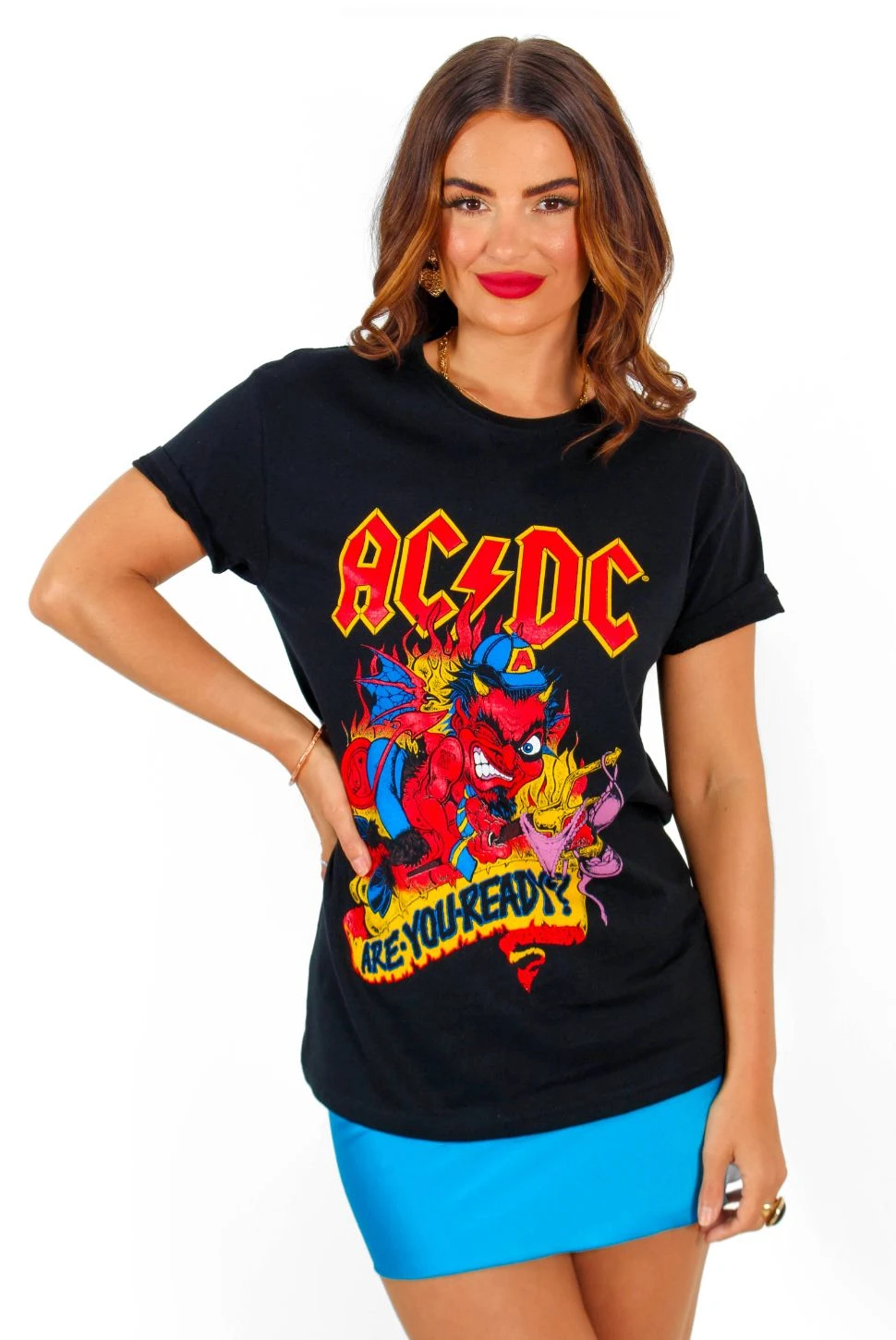We’re on the highway to serious style! Step onto the rock ‘n roll train in this iconic ACDC graphic band t-shirt. It’s got that classic crew neck tee fit in (back in) black with an edgy ACDC band print, perfect for those pub nights and mates dates. Leave ’em thunderstruck and throw it on tucked into a faux leather mini with chunky biker boots.