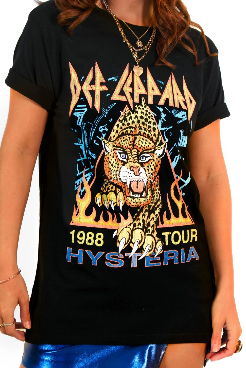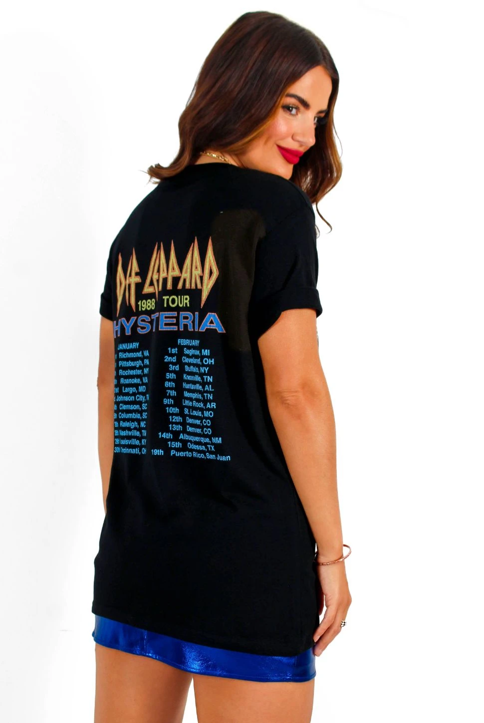 Pour some sugar on me! Giving us all the rock chick vibes, this graphic band t-shirt has got that classic crew neck tee fit in black with an edgy Def Leppard band print – there’s no foolin’ you when it comes to great style. Send them into hysteria and tuck into a zesty orange satin mini skirt with chunky sandals for a grungy but summery day drinks vibe. Grab your drink, Doll, and let’s get rocked!