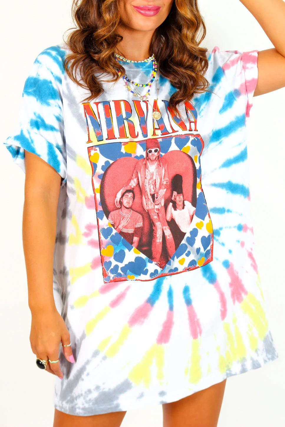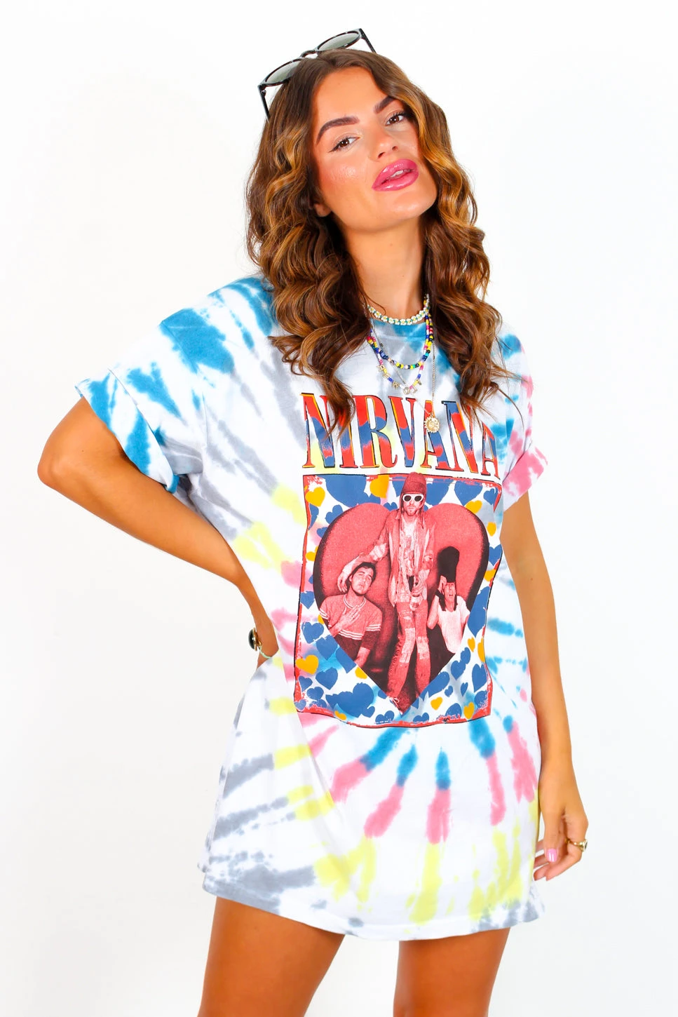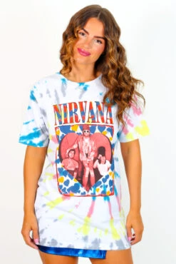 No need to get all dressed up, Doll, just come as you are! Rock off-duty chic in this grungy Nirvana graphic band t-shirt, featuring a classic white crew neck tee with multicolour tie dye and large Nirvana tribute print. Style it supersized as a super stylish t-shirt dress, or tuck it into torn mom jeans with strappy sandal heels for band nights at your local. Air guitars at the ready…