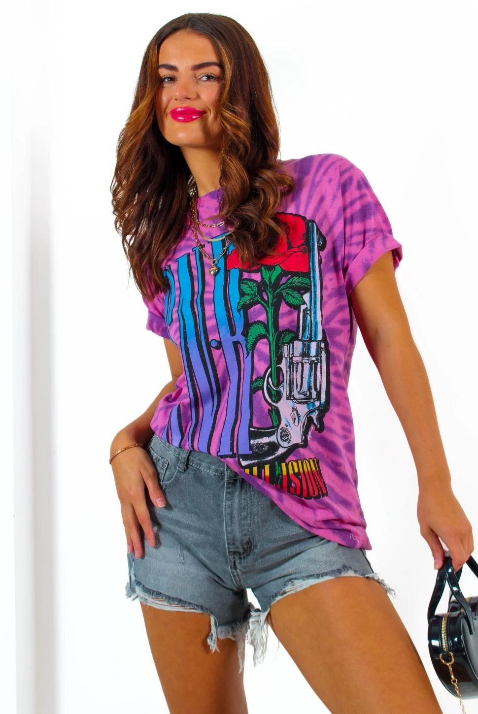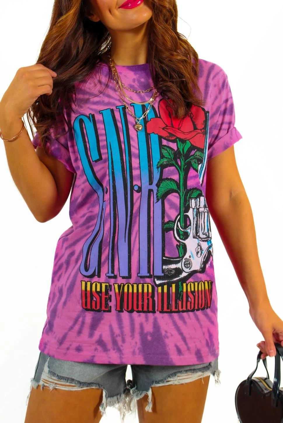 Welcome to the jungle, Doll! Serve those not-so-sweet child o’ mine vibes in this amped up Guns N Roses graphic band tee. Featuring a classic crew neck t-shirt fit in pink tie dye acid wash with large-and-in-charge Guns N Roses band graphic. Take it on tour half-tucked into torn mom jeans and chunky boots, or style super oversized with a denim skirt or cycle shorts for off-duty rock chick vibes.