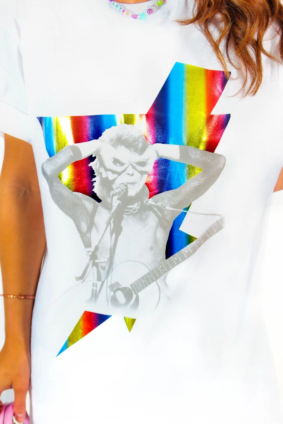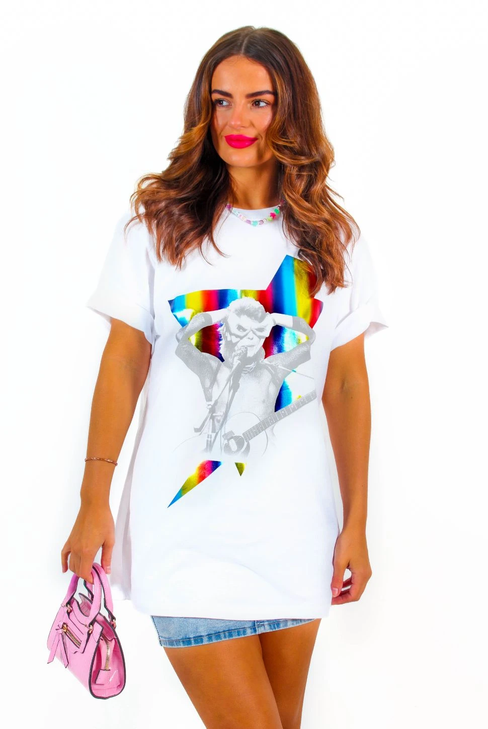 Is there life on Mars, Doll? ‘Cause you’re looking out of this world in this bright bold David Bowie graphic band t-shirt! A classic crew neck tee fit in crisp white with a holographic rainbow foil David Bowie band print, it’s top of the tops for those pub nights and mates dates. Style it super oversized as a fabulous t-shirt dress, or tuck into flowing wide leg pants with platform boots for showstopping Stargirl style. Let’s dance!