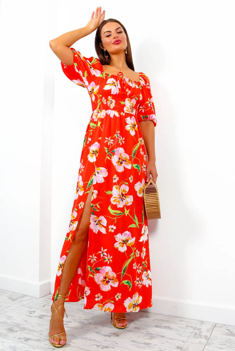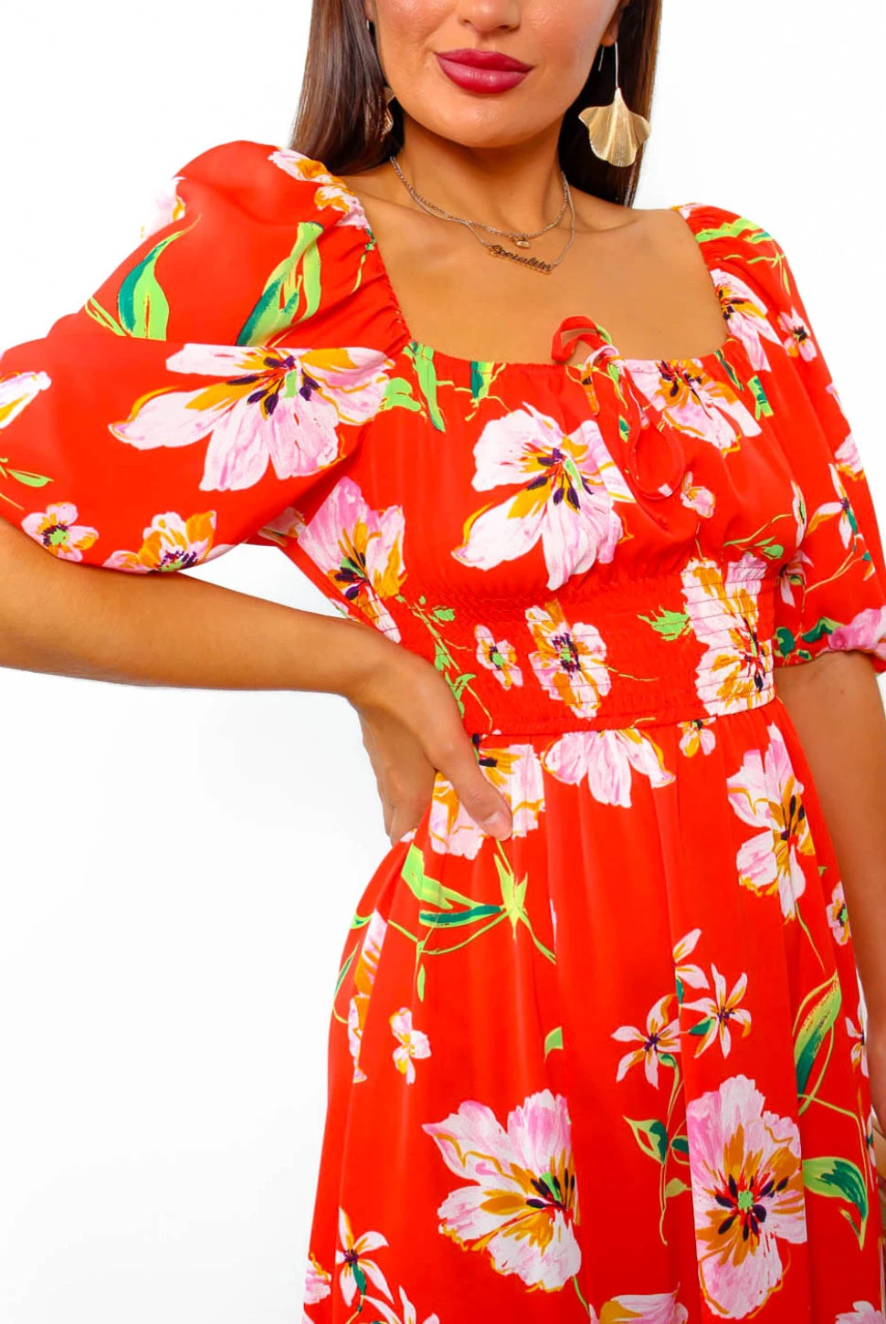 Living your best life in paradise! In sexy senorita red tones and blooming in florals, this flowy number features a comfortable but figure flattering shirred waist and a milkmaid neckline with puffed sleeves. Wear off the shoulder for maximum swoon-worthy style. Give off those Goddess vibes as you stroll the streets of the old town looking for the perfect sangria sipping spot with a tousled up do and lashings of gold jewellery.