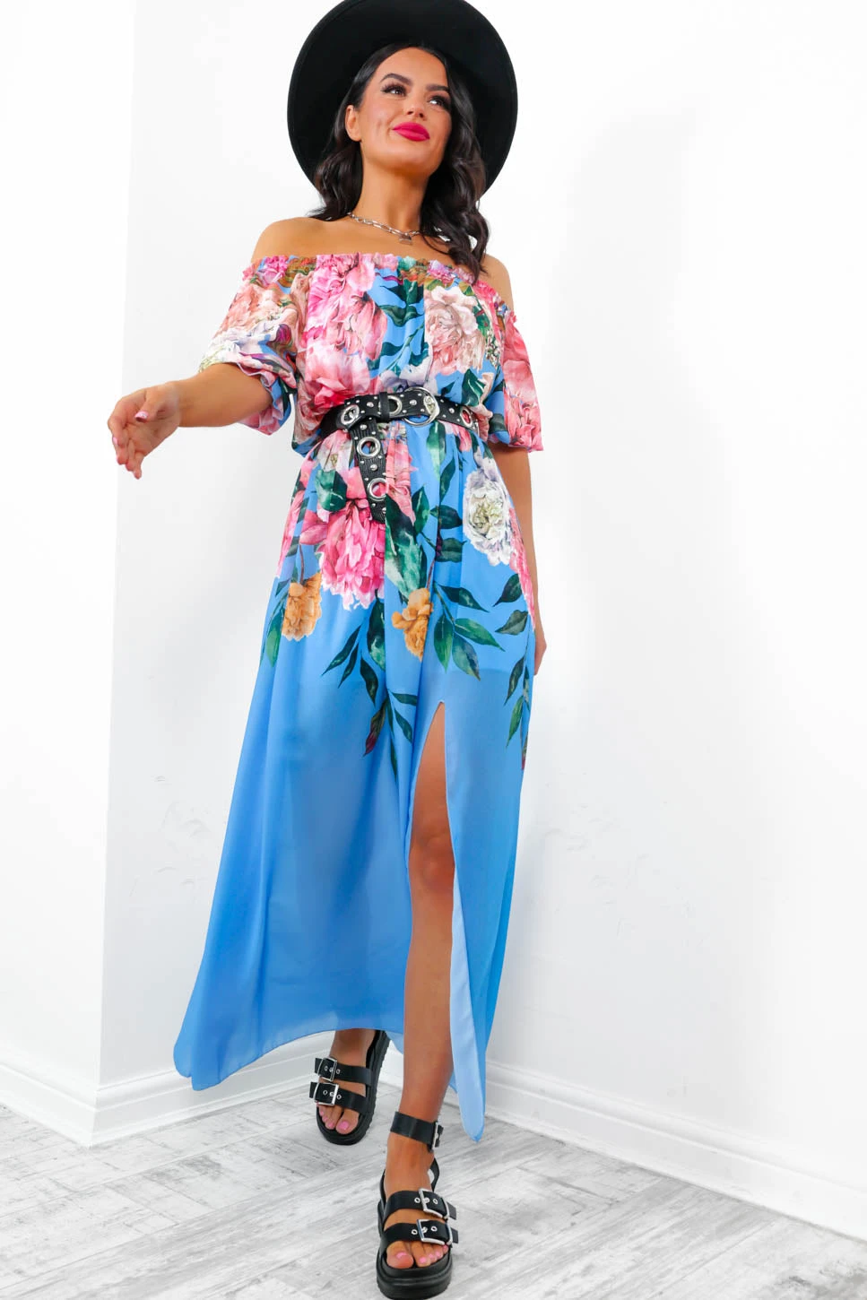 Whatever the occasion, florals will fit. This whimsical maxi dress features a beautiful pink floral design leading into a blue chiffon-style fabric, an elasticated off the shoulder-neckline, short frilled elastic sleeves, a high elasticated waistband, and a slight leg split to balance out the silhouette. Dress up with pastel accessories for a look that will see you through any special occasion from a baby shower to a wedding.Â