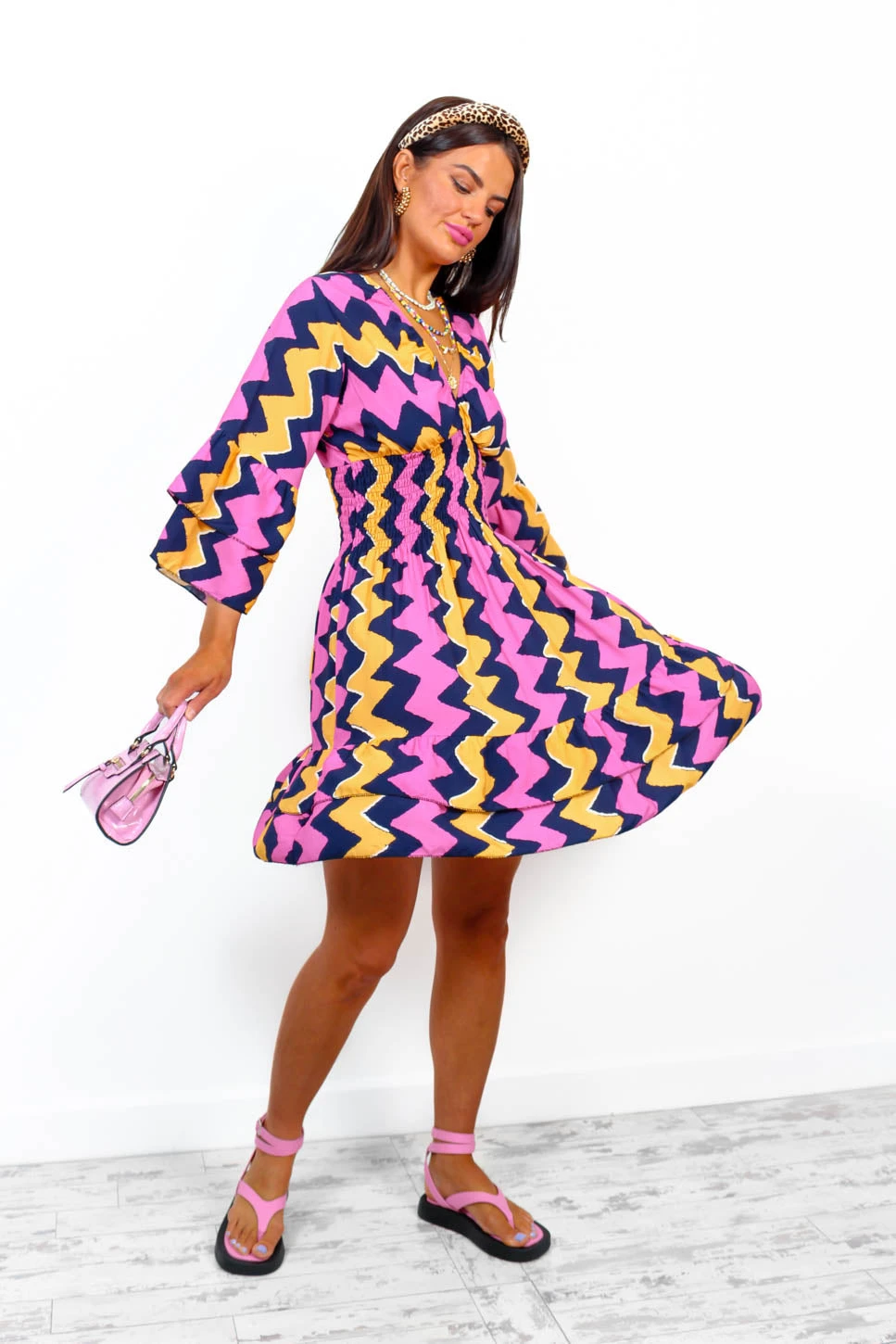 The most important part of booking a holiday is outfit planning. This stunning mini dress features a navy, pink, and yellow zig zag print, 3/4 flared sleeves, a shirred waistband to flatter those curves, and a tiered hemline. Go pink on sandals for a cute look that will have everyone asking who you are in the beach club.Â