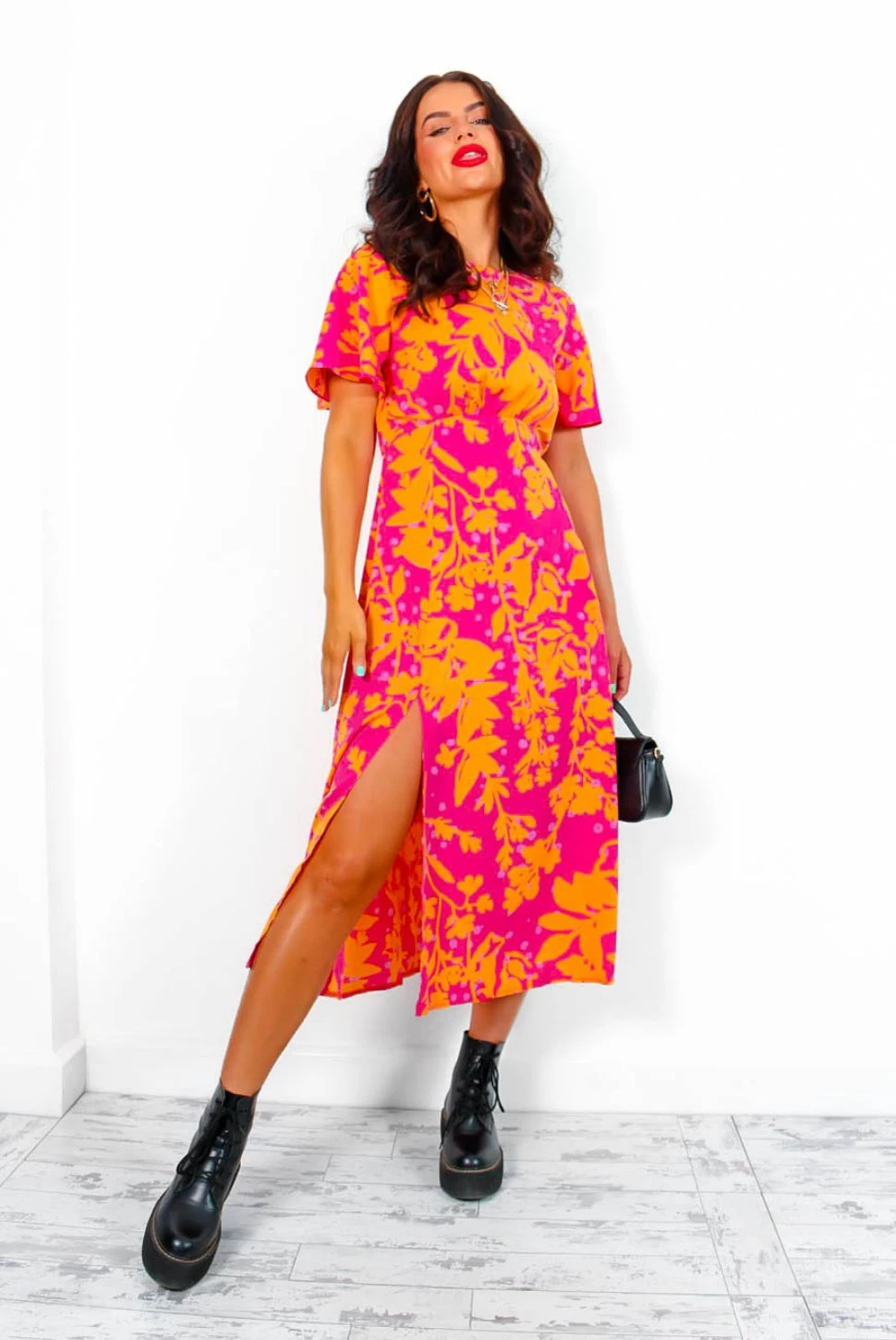 We are in love with pink and orange this season, it’s contagious! This tropical print midi dress features short floaty sleeves, a rounded neckline, zipped back, a flattering under bust seam, and that iconic leg split. You’ll have the room feeling tropical from the moment you step through the door! Pair with orange stiletto heels and a matching clutch.