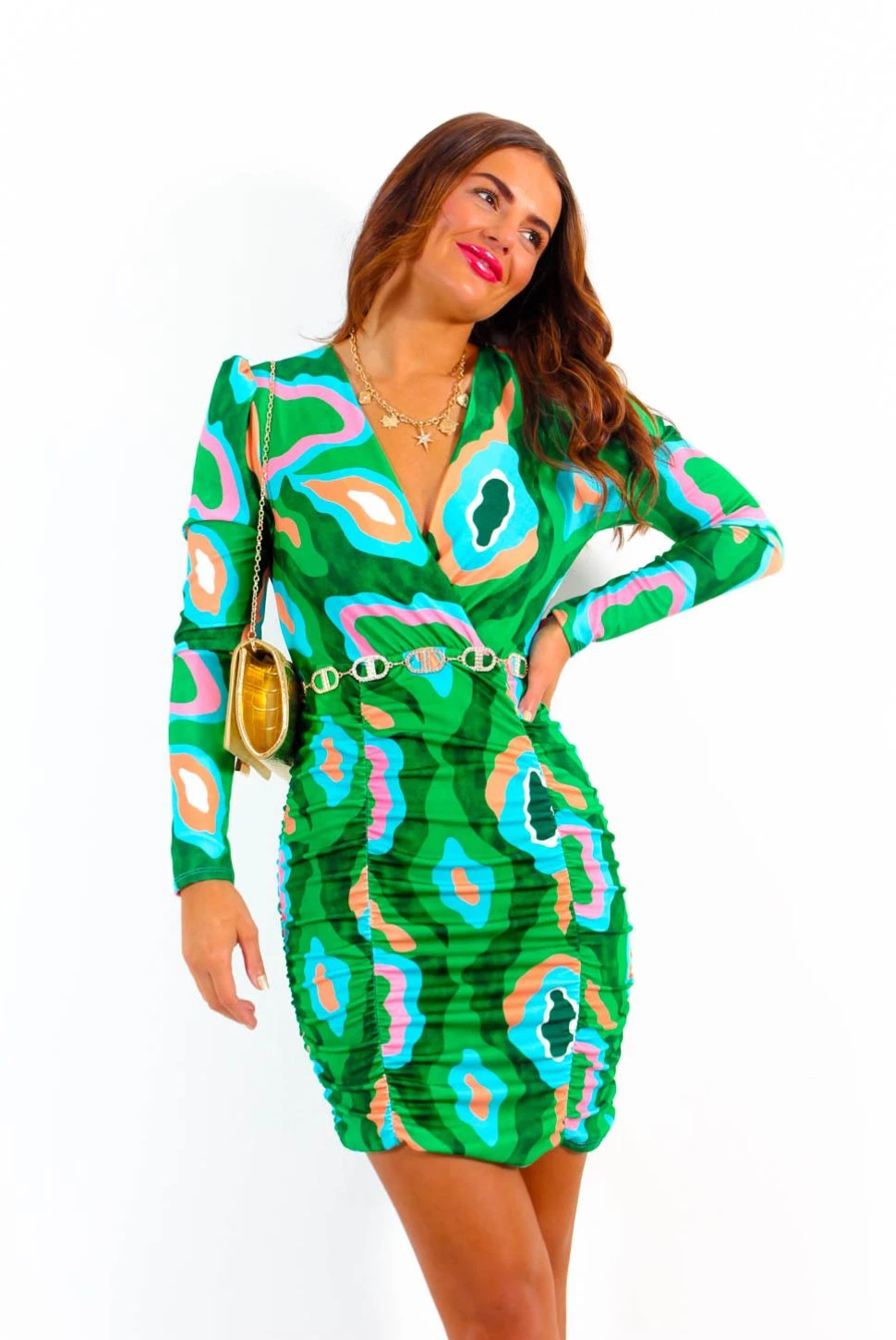Bright, bold and bursting with personality – that’s the way we like it, Doll! With flattering ruched detail throughout, a daring plunged neckline and a figure hugging bodycon fit, this mini dress will certainly be joining us for brunch with the besties. Complete with long sleeves and a funky green, blue and pink abstract print – we are obsessed. Colour clash like a queen with pops of pink accessories and a matching lip!Â