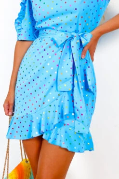 Ain’t no party like a polka dot party! In a mini length and spotted throughout, this blue and white mini has totally stolen our hearts. With a doll-like frilled tier hemline, plunging crossover neckline and material belt to shape and enhance the silhouette, this is deffo our next brunch ‘fit! Go all blue on the accessories for a stand out party look!Â