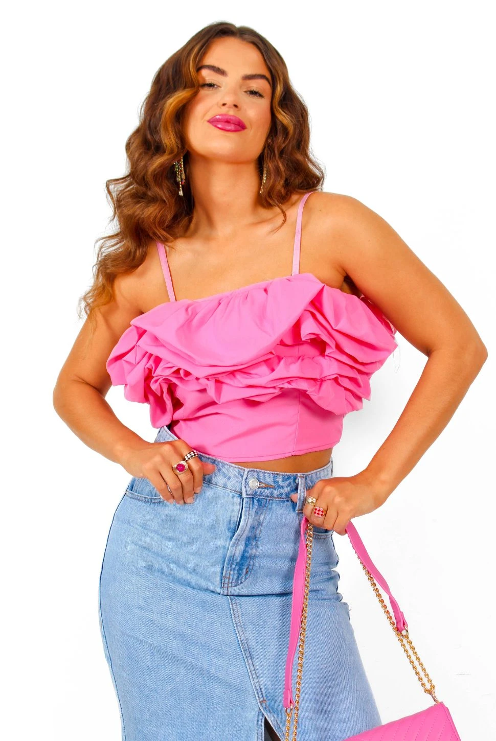 All eyes on you and they can’t look away! Make ’em do a double take in this stunning statement ruffle crop top. With elasticated shirred back panel detail and adjustable straps you can tuck in to create a bandeau style, it’s the perfect addition for those off-duty jeans-and-top fits to glam going out-out fits. Dress down with distressed jeans and chunky high tops, or turn heads at that brunch with killer heels and a slick of red lippy.