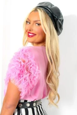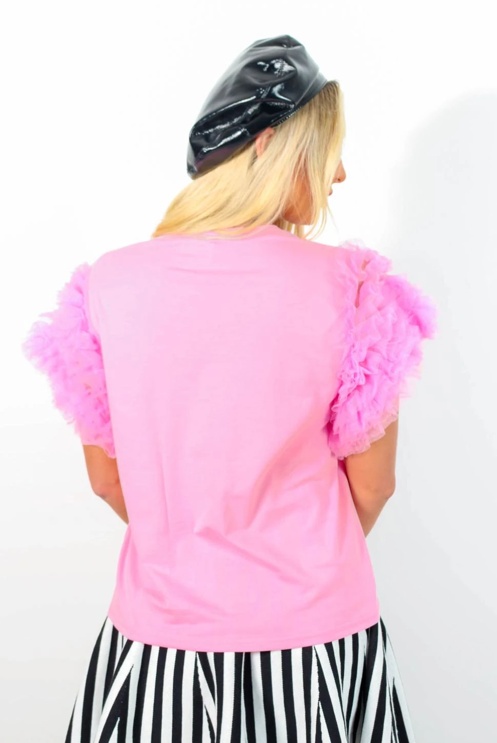 A fashionista is never too late, she always arrives at the right time. Be at the top of your ‘casual’ tee game and totally freshen up your off-duty style. Your what to wear dilemmas are no more as this t-shirt brings all the drama with its tulle ruffled sleeves! Throw on with high waisted denim shorts and fresh kicks for an effortlessly cool girl sunny day look.Â