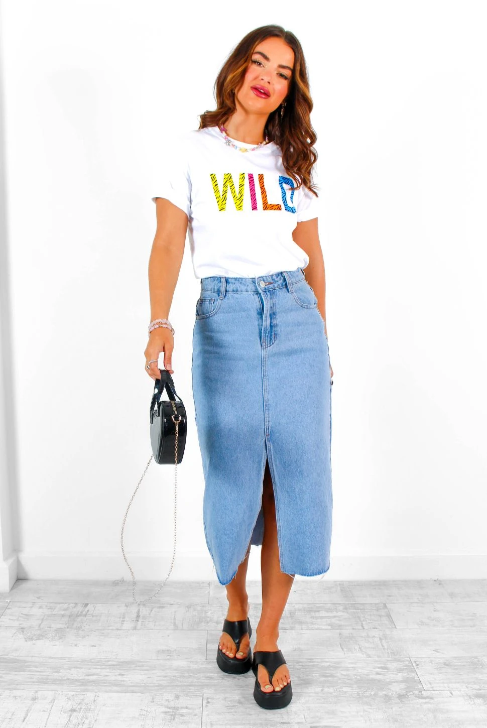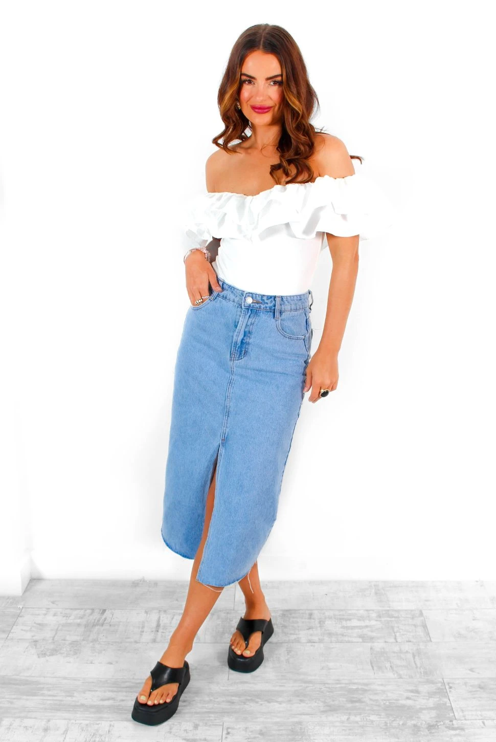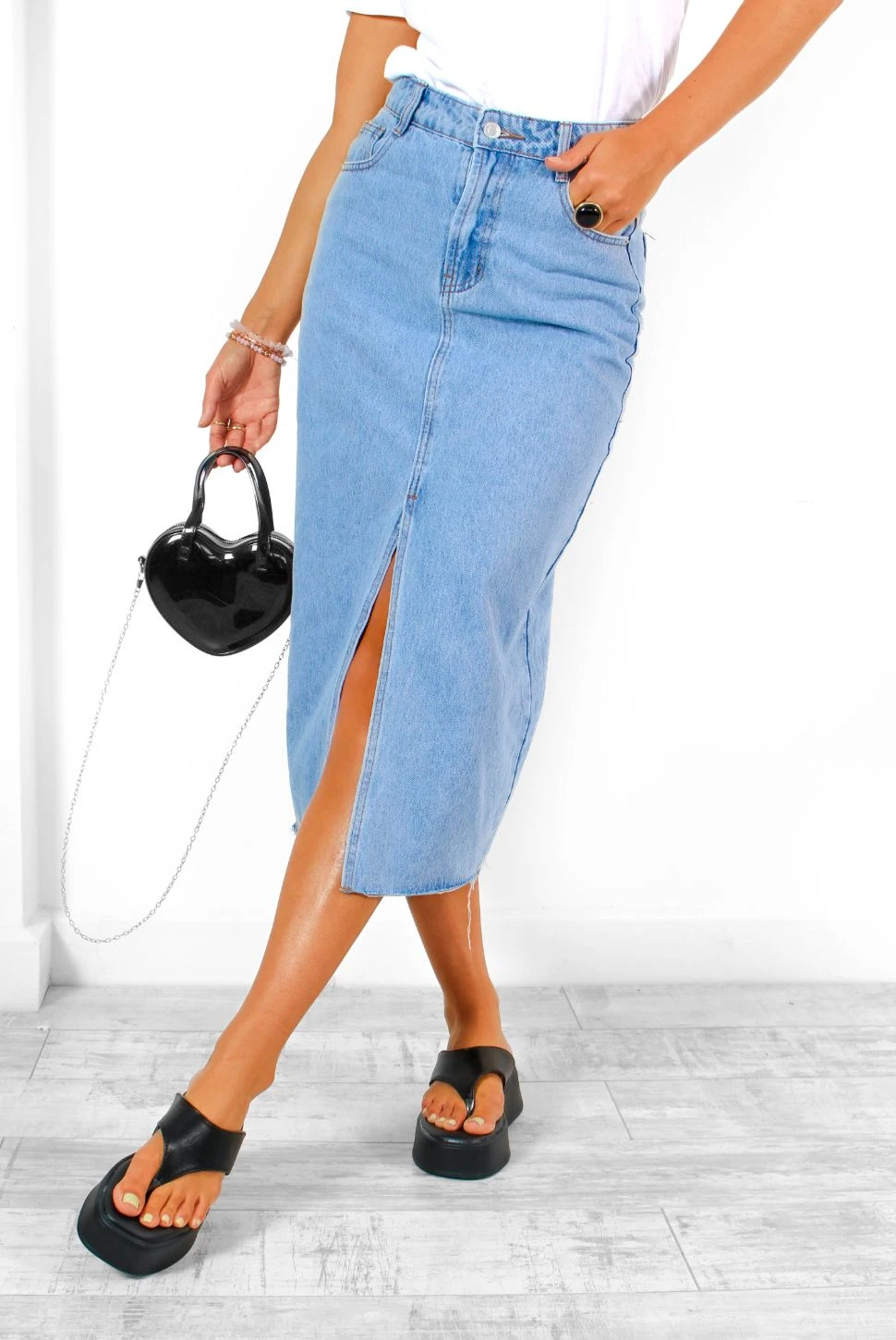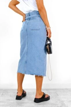 Unleash your inner denim diva, Doll! We can’t promise this blue denim midi skirt won’t get the complements flowing. With a high rise and five pocket design, it’s perfect for showing off your sassy side with a front split that reveals just the right amount of leg. Keep it cute with a nude lip and flowy blouse, or amp things up with an edgy graphic band tee and biker boots. Who knows where the night will take you!