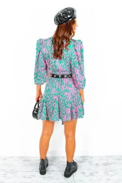 We see ya, skater girl! Wanna make a statement with your daytime dressing? This leopard print mini dress featuring a flattering fit with long puff sleeves, elasticated tie waist and floaty pleated skirt is the way to go. With a bold bright turquoise and pink animal print, this is a made-in-heaven mini for swishing from dinner dates to dancefloors – can we make it any more obvious? Accessorise with an all-black boot and bag combo for AM activities, or a pretty pink heel for evening events.