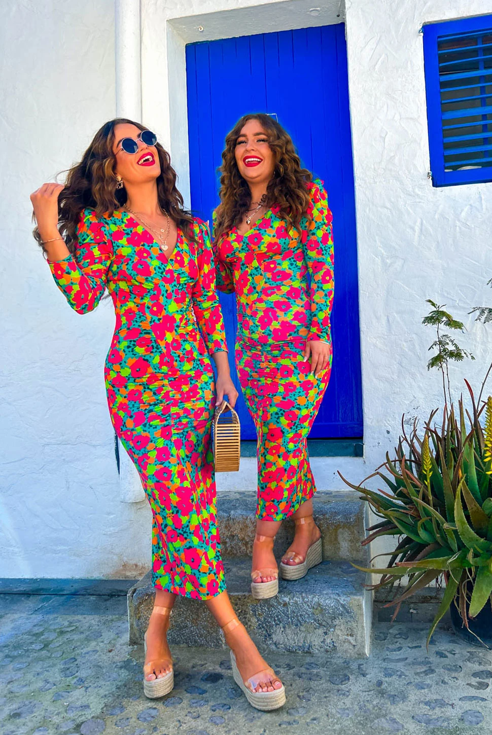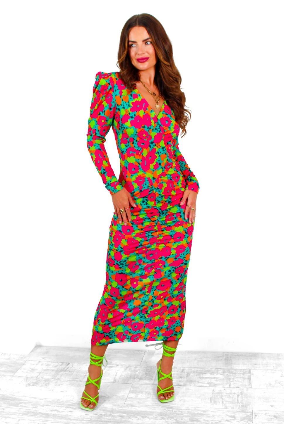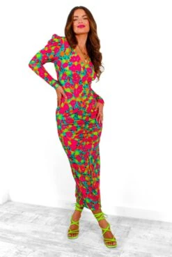 Diamonds are a Doll’s best friend! In a midi length, this showstopping floral bodycon dress is the ultimate statement piece for any fashion forward gal. Figure hugging to create a stunning silhouette, this baby blooms with a bright green and pink floral print, long sleeves with shoulder pads for girl boss energy, and a ruched diamond front. We’re all about the details! Pick out the dress colours with a matching pink or green heels and clutch for those bestie’s birthday meals where your presence is the gift!