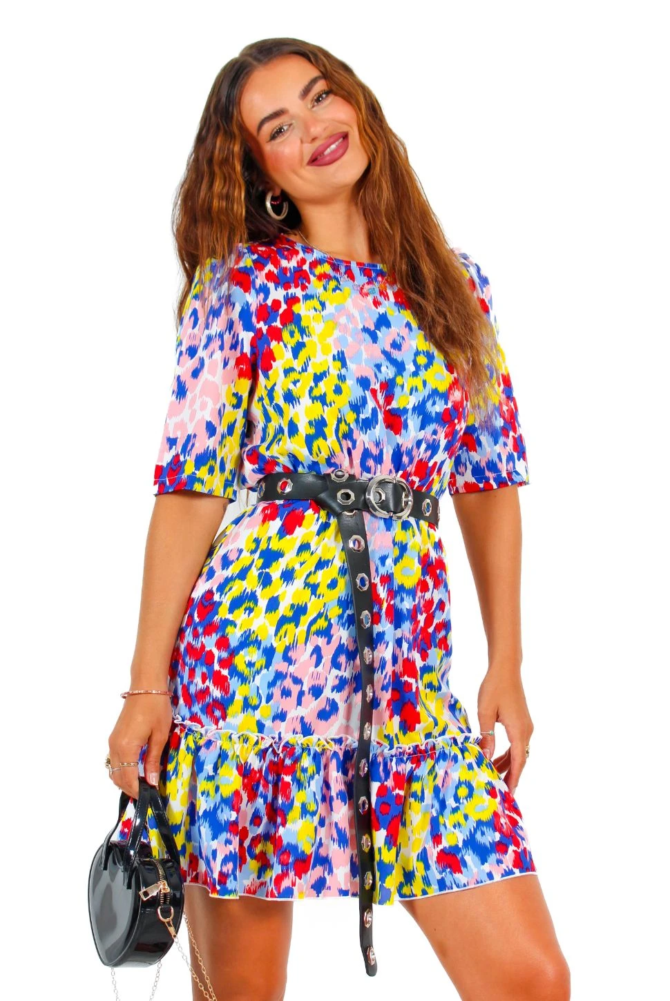 Your dress sense is perfect darling. This charming mini dress features an explosion of tones of pink, blue, and yellow leopard print, a rounded neckline, short sleeves, an elasticated waistline, and a frilled hem. Team with sandals for holiday plans or blue strappy heels for brunch dates with the girls.Â