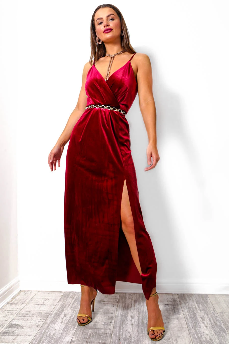 Go all-out glam this season, Doll! This sophisticated floor-length velvet dress comes in a rich wine velvet fabric with spaghetti strap cross-over bust, elasticated waist to flatter your figure, and a fierce leg split at the bottom. Perfect for those who love a 20s moment! Pair with killer heels, a striking red lip and matching glass of red.