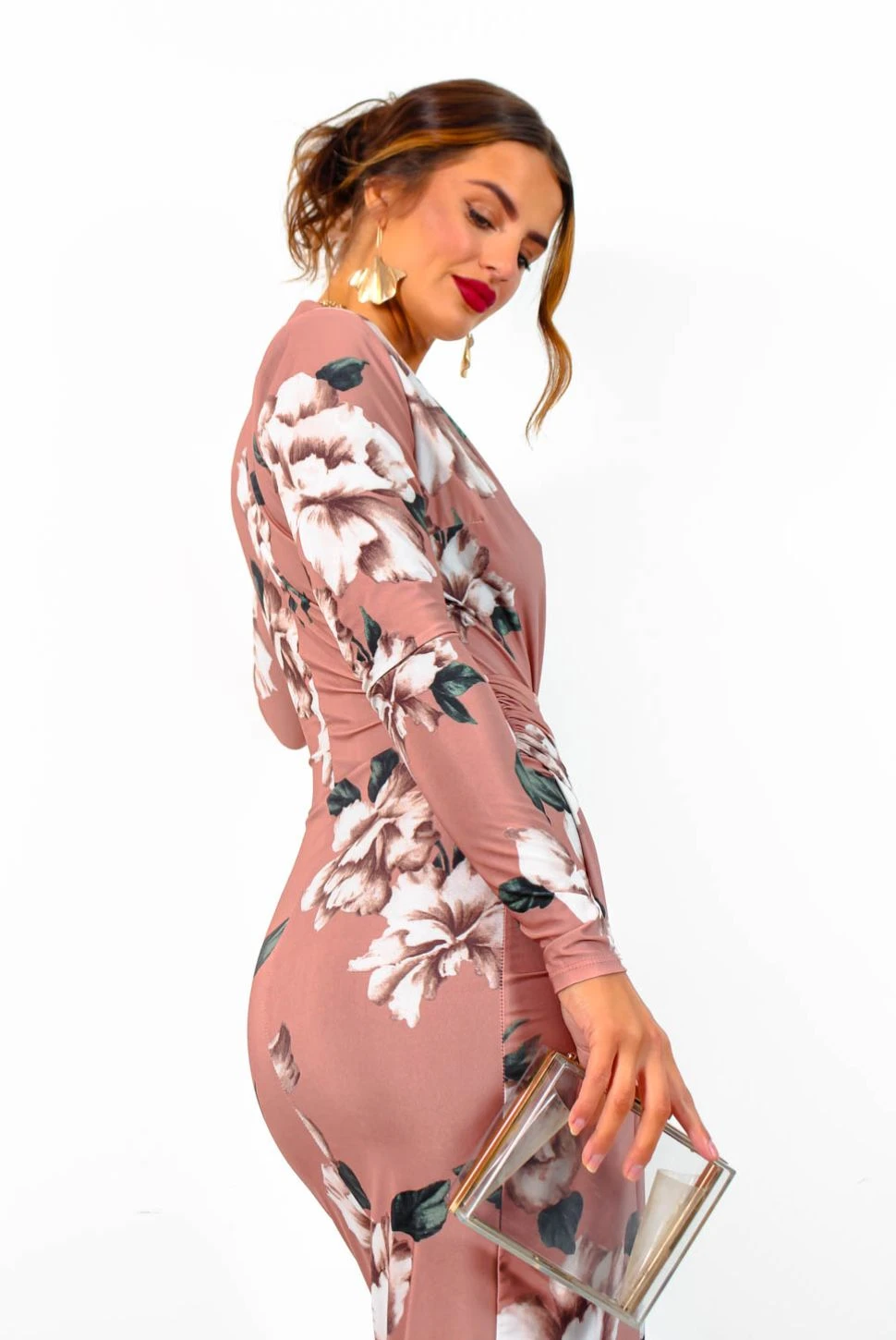 Neutrals should always in a staple in your wardrobe, no matter the season. This stunner features a nude floral design in a slinky fabric, long sleeves, a plunging neckline, and a draped front leading into a flattering front slit, this bodycon midi dress hugs your curves to give you that sexy look on a night out. Add gold heels and a dark lip for a edgy look.