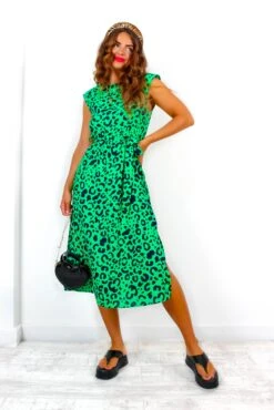 Spotting you in a crowd? That’s easy, baby! Look fierce at your next get-together in this stunning leopard print midi dress. Featuring a green base with black animal print, this sleevelessĀ stunner features subtle shoulder pads, a removable fabric waist tie and two side leg splits for added flirty flair. Team with strappy black sandals andĀ a slick of red lipstick for a look to drive the bar wild!