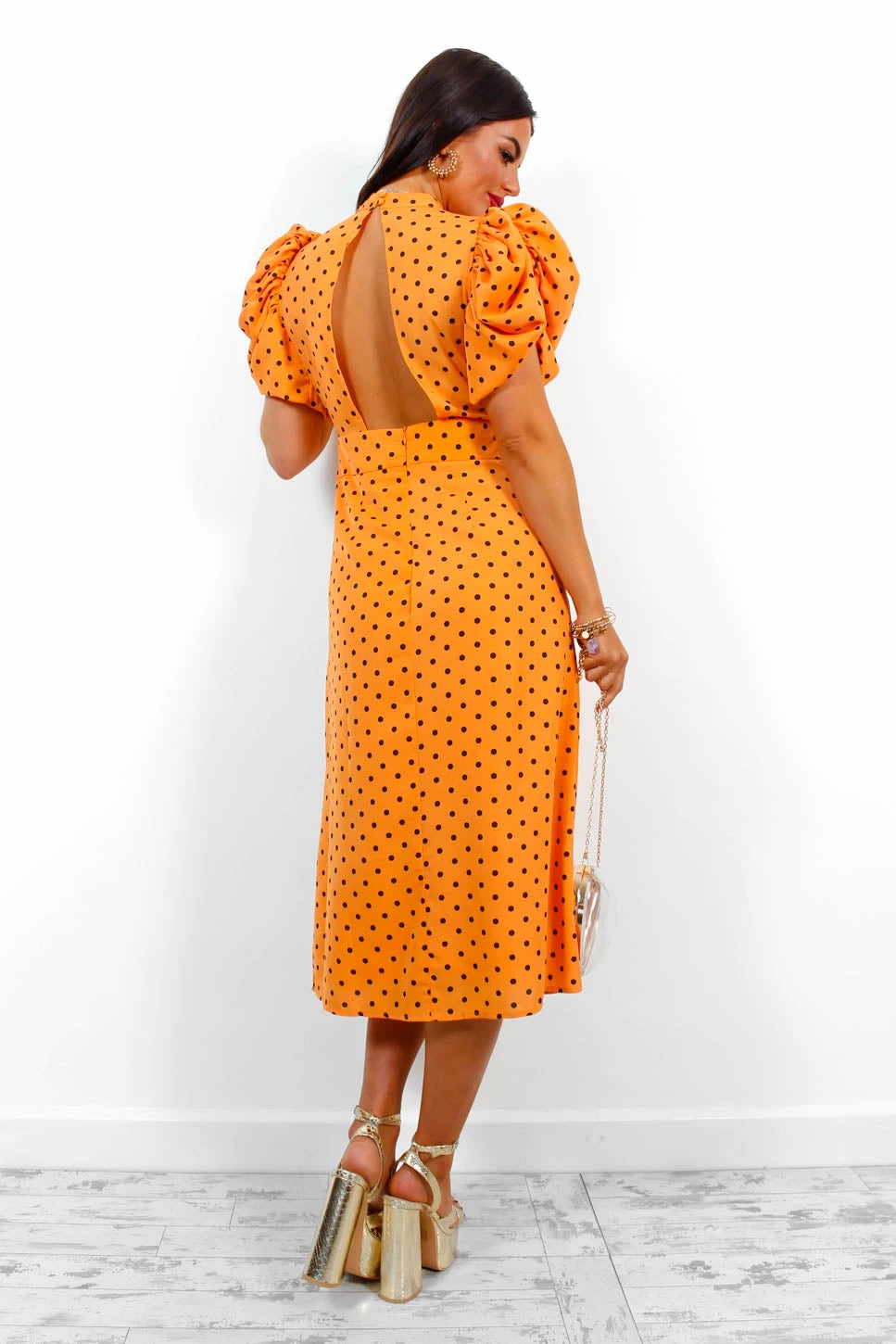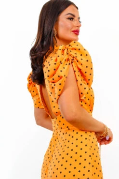 Nothing can go wrong when you’re in the right dress! Featuring an orange polka dot print, cut out back detail that just oozes glamour, complete with a flattering fitted silhouette and trending dramatic puff sleeves. This super sophisticated midi dress is a guaranteed show stopper that’s sure to get you spotted! Gold and orange are a match made in heaven, so style with gold heels and matching jewellery to give that extra wow factor.