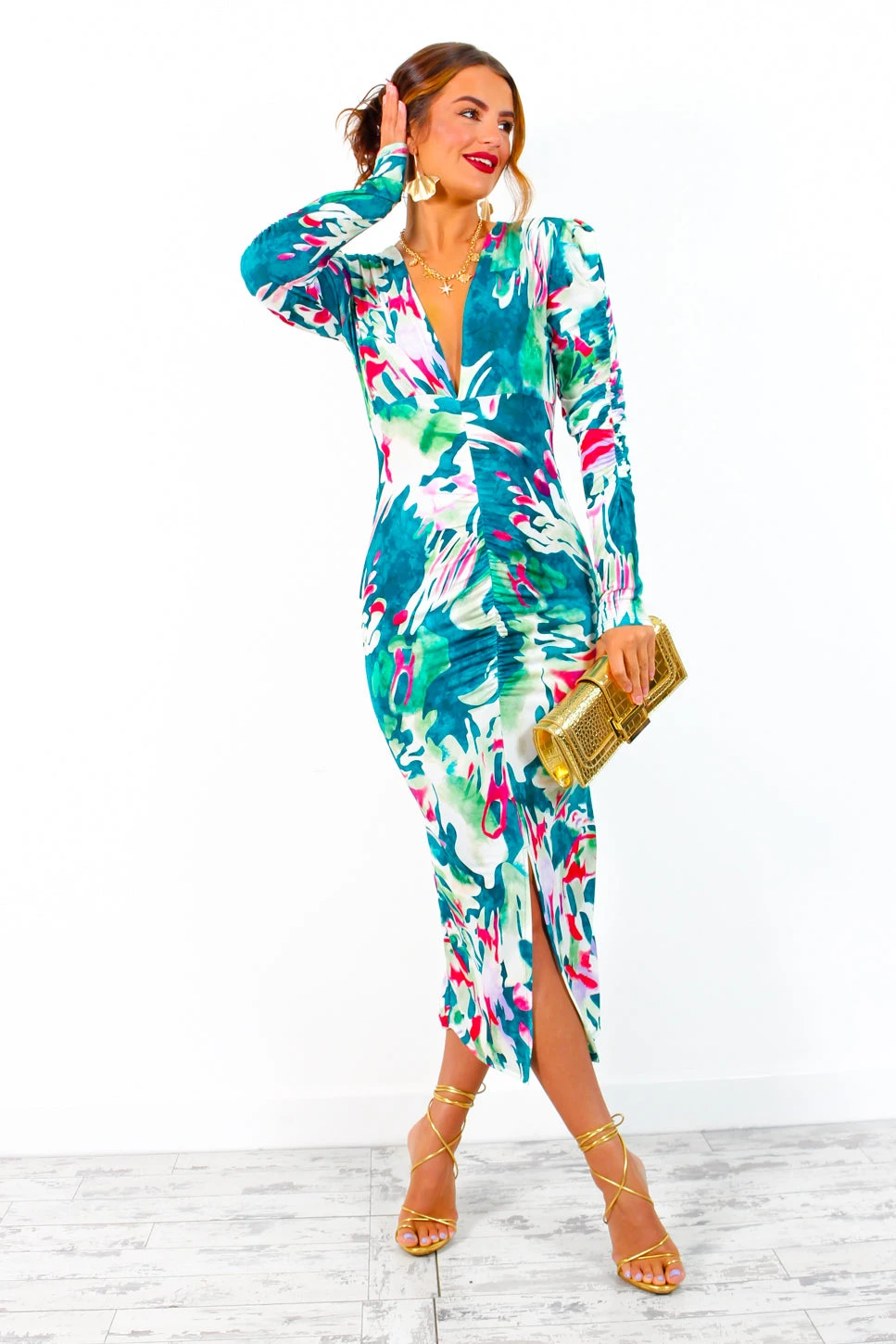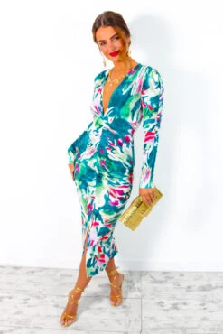Life is better when you’re brunching with the Dolls… and wearing a beautiful dress! In a midi length, this gorgeous green bodycon dress is the ultimate statement piece for any fashion forward gal. Figure hugging to create a stunning silhouette, this midi is finished with an abstract print throughout, long sleeves, aĀ plunging neckline and a flatteringĀ ruched front with a cheeky split. Glow all evening in gold accessories and a red lip.Ā